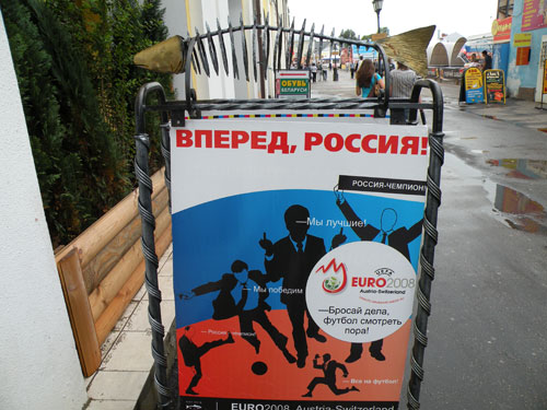 Описание: Штендер установлен около центрального универмага г. Владимира. Информация на штендере призывает болеть за Российскую сборную, при этом зрители должны показывать всем "Средний палец", всем кого увидят. Извините, но эпатаж не удался