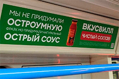 ВкусВилл разместил рекламные плакаты с честными копирайтами в вагонах московского метро в рамках федеральной рекламной кампании «Чистый состав». Стикеры созданы без сложных слоганов и остроумных фраз – только демонстрация принципов работы с составами продуктов.