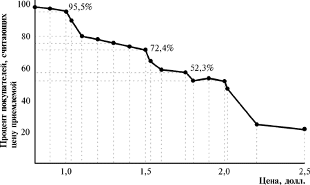 Большой интерес представляет построение кривой спроса и нахождение на ней ключевых точек для нового товара. Так, в работе [4] приводятся результаты опроса покупателей у дверей универмага Kmart относительно покупки новой продуктовой воронки. Им задавался вопрос: "Какова максимальная цена, которую вы заплатили бы за данный товар?" Сначала каждому покупателю были продемонстрированы другие воронки, имеющиеся в продаже в данном универмаге, по цене в 2,99 и 4,99 доллара. Как видно из графика на рис. 2, скачок кривой спроса имел место в ценовых точках при цене за воронку в 0,99, 1,49 и 1,99 доллара.