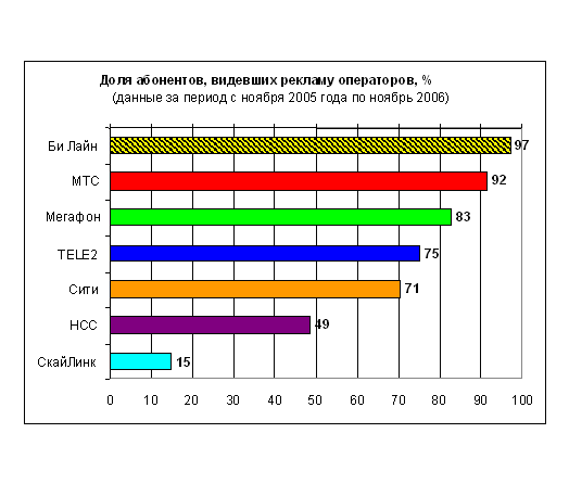 Из всех операторов, пожалуй только один Билайн за весь период удерживал уровень своего рекламного присутствия на одном и том же – практически, максимально возможном – уровне. МТС также старался удерживать занимаемые позиции, однако на фазу активного ребрендинга – временной промежуток с февраля по май 2006 года приходится некоторое снижение доли абонентов, видевших рекламу оператора. Связано это, очевидно с тем, что как раз в то время МТС стал избавляться от своих старых рекламных плакатов и роликов, замещая их изображениями нового логотипа, не соотносившегося еще в сознании потребителя с брэндом оператора. Впрочем, в последнее время МТС начинает выходить на занимаемый им ранее уровень узнаваемости. Оператор Мегафон, напротив, демонстрирует некоторое снижение рекламного присутствия, хотя говорить об устойчивой тенденции здесь не приходится: для этого оператора были характерны скорее колебания доли абонентов, видевших его рекламу. Причем, колебания эти проходили в довольно широких пределах, в коридоре от 70% до 90%.