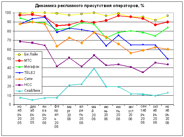 Довольно заметно снизилась за год доля абонентов, видевших рекламу TELE2, Сити и НСС. НСС, как и Сити в течении весенних и летних месяцев смогли приостановить снижение своего рекламного присутствия, и на данный момент занимают довольно устойчивые позиции в коридорах значений 60%-70% (Сити) и 40%-50% (НСС). В отношении же TELE2 о такого рода стабилизации говорить пока рано. Доля абонентов, видевших TELE2, снизилась с чуть менее 90% в ноябре 2005 года до 50% в настоящее время, и судя по виду соответствующего графика, здесь есть все основания ожидать дальнейшего снижения. Компания Скайлинк в течение весны 2006 года наращивала свое рекламное присутствие в Нижнем Новгороде, пиковый показатель пришелся на май (в тот же период повышение рекламной активности демонстрировали НСС, Сити и Мегафон). Причем этот всплеск узнаваемости Скайлинк, судя по восприятию абонентов, был связан прежде всего с телевизионной рекламой оператора.